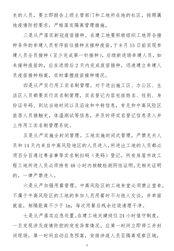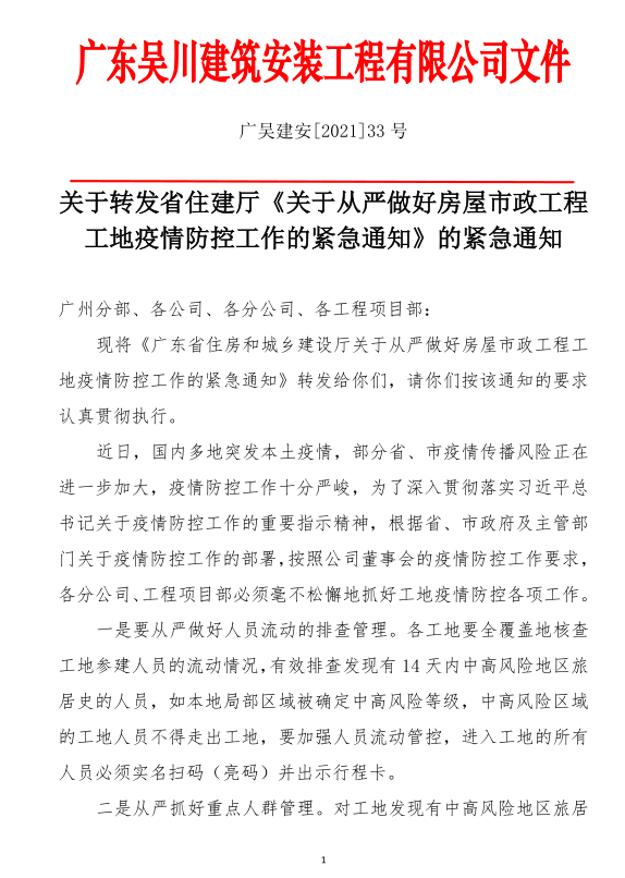 近期,國內(nèi)多地突發(fā)本土疫情,江蘇宿遷、湖北武漢等地建筑工地已出現(xiàn)新冠肺炎確診病例,疫情在工地傳播的風(fēng)險進一步加大。為深入貫徹落實習(xí)近平總書記關(guān)于疫情防控工作的重要指示精神,根據(jù)省委、省政府關(guān)于疫情防控的工作部署,按照全省疫情防控和安全生產(chǎn)電視電話會議要求,我廳決定在認真執(zhí)行2020年2月印發(fā)的《廣東省房屋市政工程工地防控新冠肺炎疫情工作指引》的基礎(chǔ)上,對部分常態(tài)化疫情防控措施進行提檔升級,提出了以下9方面要求。請結(jié)合本地區(qū)工作實際認真貫徹落實,毫不松懈地抓好房屋市政工程工地疫情防控各項工作。