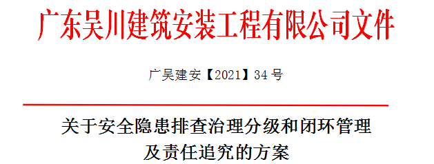 為建立安全隱患排查治理長效機(jī)制,強(qiáng)化安全生產(chǎn)主體責(zé)任,加強(qiáng)安全隱患治理,防止和杜絕事故發(fā)生,保障施工項目的安全生產(chǎn),現(xiàn)結(jié)合公司的實(shí)際,特制定安全隱患排查治理分級和閉環(huán)管理及責(zé)任追究的方案。