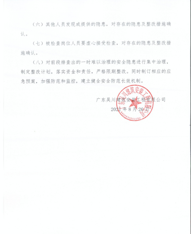 (三)項目部必須建立安全隱患排查考核管理制度,對安全隱患跟蹤落實(shí)、閉環(huán)管理,每次排查隱患工作結(jié)束,都必須做到“六閉合”(即排查、記錄、匯報、整改、驗(yàn)收、統(tǒng)計分析)。