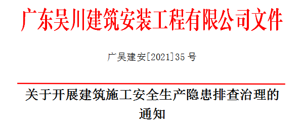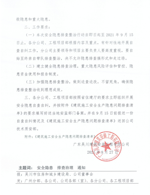 一、根據省、市住建主管部門關于全面開展建筑施工安全生產隱患排查治理的通知要求,公司董事會要求各分公司、工程項目部從即日起對在建工地開展建筑施工安全生產隱患排查治理行動。
