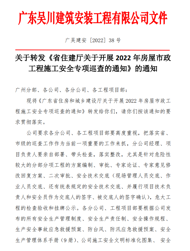 為認真落實《住房和城鄉建設部關于開展房屋市政工程安全生產治理行動的通知》(建質電〔2022〕19號)、《廣東省安全生產委員會關于印發<廣東省安全生產大檢查工作實施方案>的通知》(粵安〔2022〕6號)工作部署,進一步壓實建設各方安全生產主體責任,治理施工安全突出問題,切實提升全省施工安全管理水平,按照我廳今年重點工作任務安排,結合我省城市建設安全專項整治三年行動有關工作實際,我廳通過政府購買服務的方式,委托第三方專業機構,開展全省房屋市政工程施工安全專項巡查?,F將有關事項通知如下:
