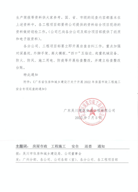 此次安全專項巡查工作時間長、涉及面廣,請各地級以上市住房城鄉建設主管部門安排1名業務骨干作為巡查工作聯絡員,于7月6日前將在建項目清單(附件1)、聯絡員名單回執(附件2)報送我廳工程質量安全監管處。并請于安全專項巡查組檢查工作結束后一個月內將有關整改情況和執法查處情況報送我廳。