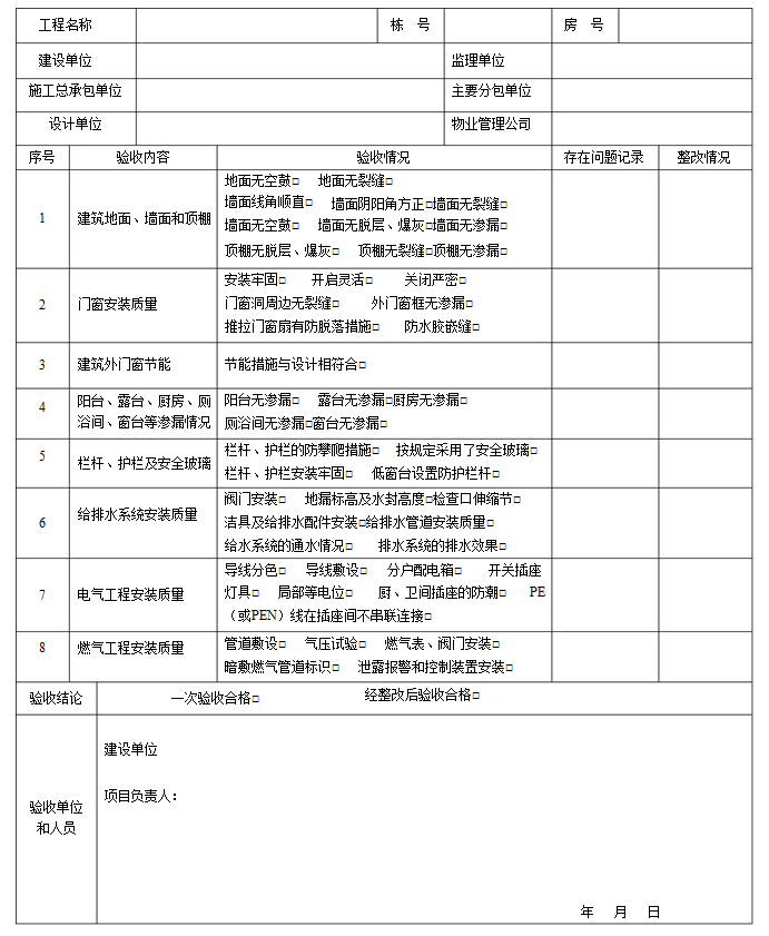 住宅工程分戶驗收觀感質量檢查驗收表填寫說明